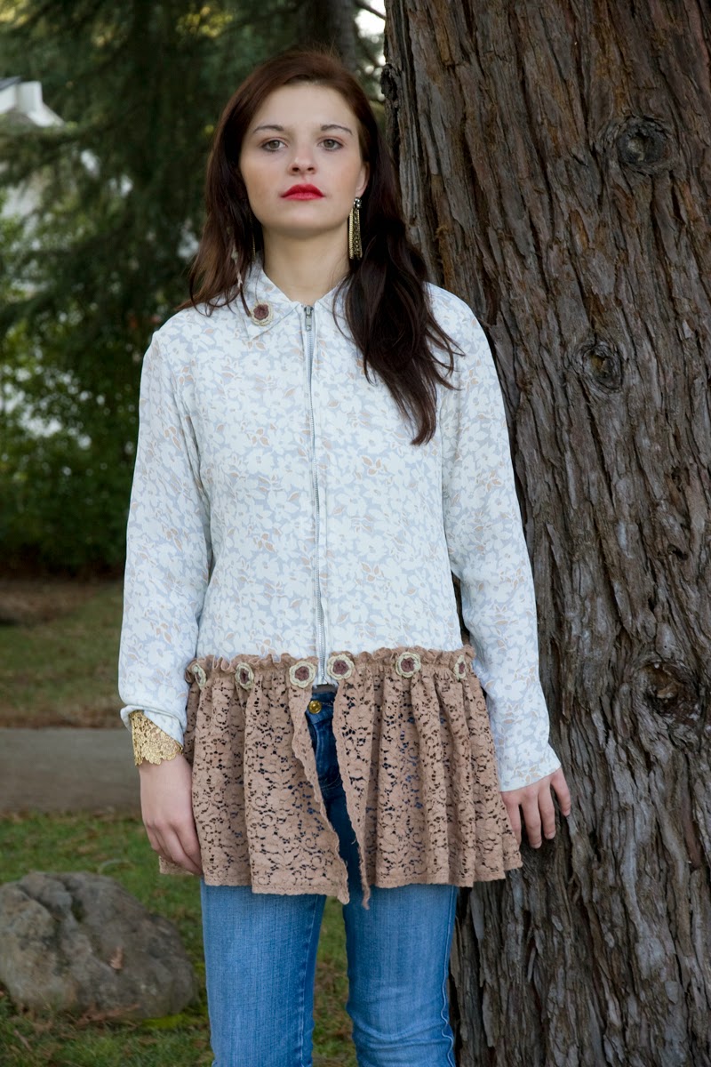 This shirt requires one shirt that fits (the red plaid) and three other shirts that make parts of the skirt. I used large mens shirts for the skirt parts. I also used a flounce (or ruffle) from a vintage petticoat half slip. If this is a garment you would like to make that would be the clothing items you need to bring. This sample is not fully sewn and only pinned on so things aren't quite straight but you get the idea? I'll probably add more embellishments but this shows you how it can look.